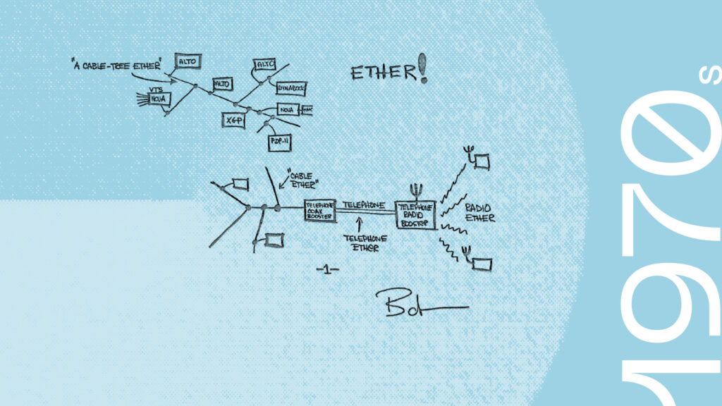 An internal memo at PARC, now part of SRI, proposed a system of linking workstations, files, and printers together using a coaxial cable within a local area network. The benefit would be that components can join or leave the network without disturbing data traffic. The memo’s author coined the term “Ethernet” to describe the network. Ethernet grew into a global standard.