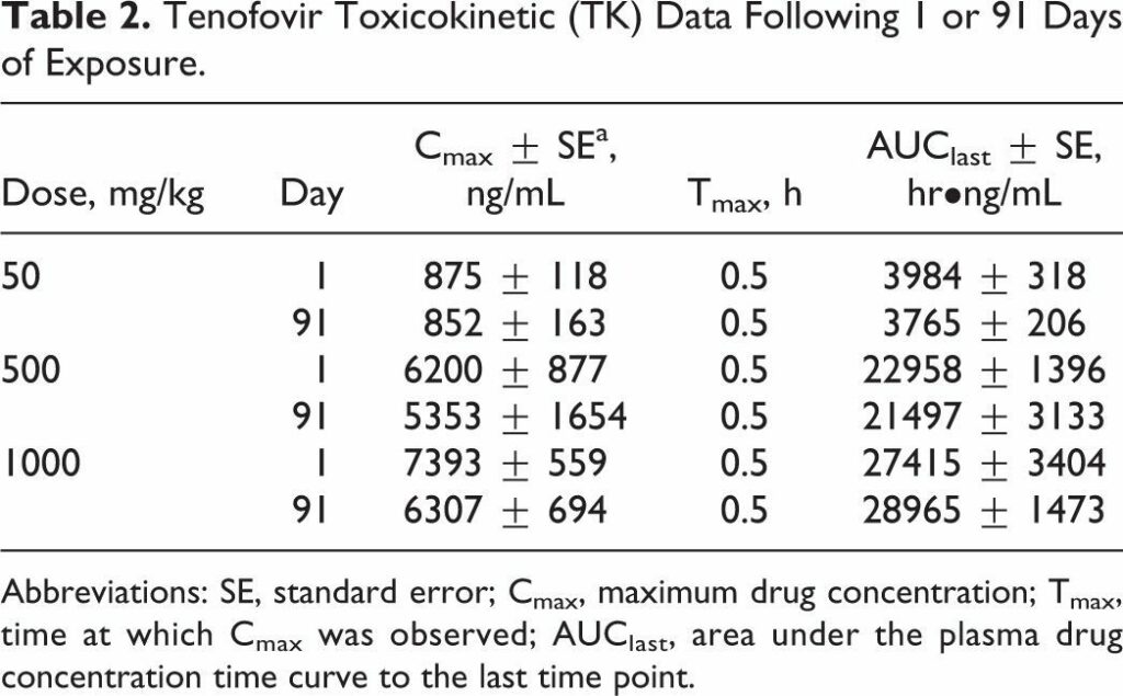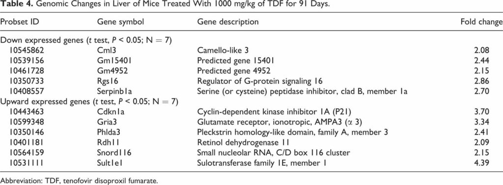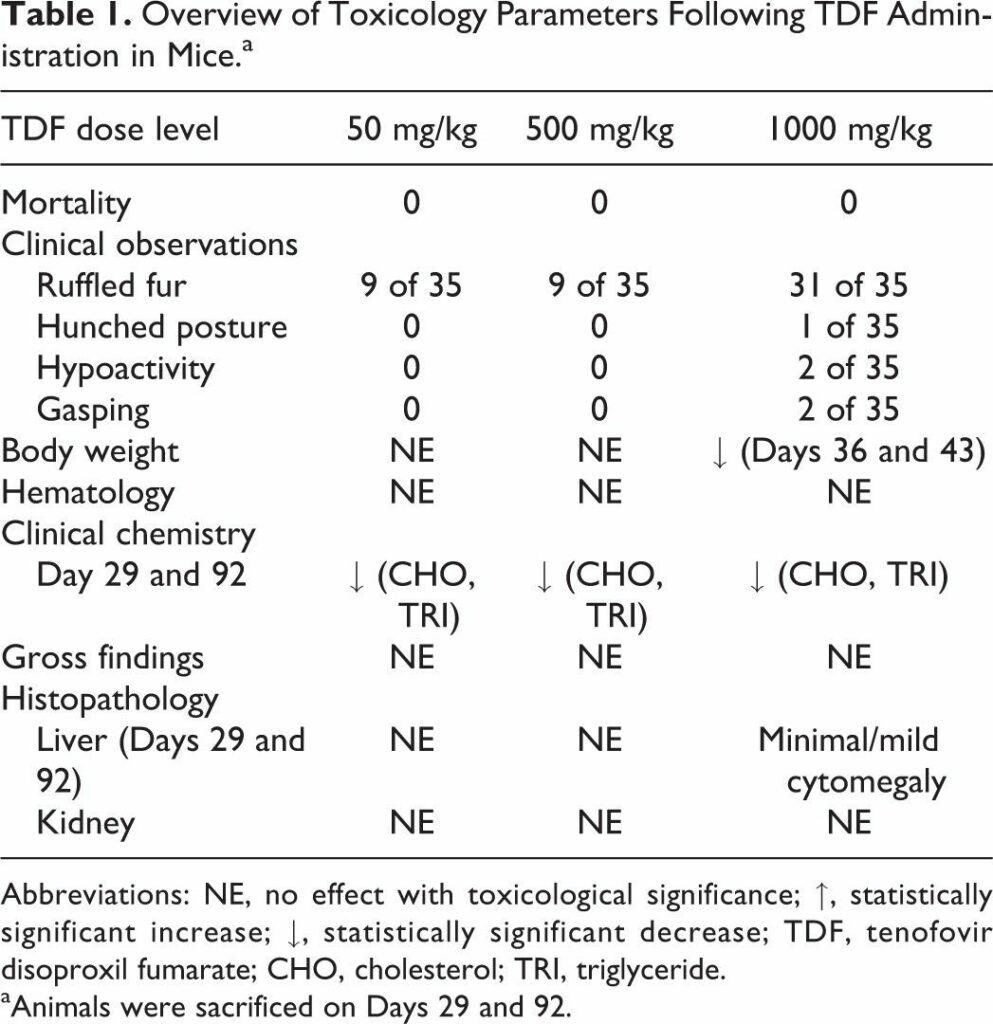 Ng, H. H., Stock, H., Rausch, L., Bunin, D., Wang, A., Brill, S., … Mirsalis, J. C. (2015). Tenofovir Disoproxil Fumarate: Toxicity, Toxicokinetics, and Toxicogenomics Analysis After 13 Weeks of Oral Administration in Mice. International Journal of Toxicology, 34(1), 4–10.